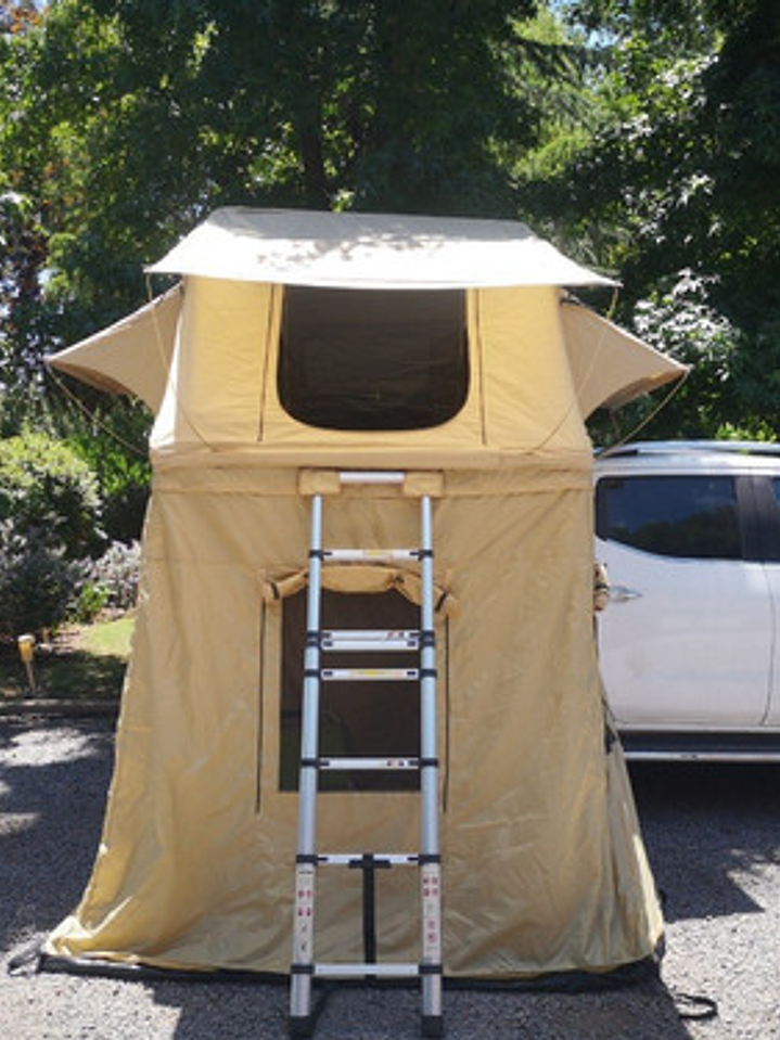 La estructura de la carpa está sostenida por postes de aluminio resistentes de 25mm para las estructuras principales y un poste adicional de 16mm. El acceso es fácil con la escalera telescópica de aluminio de 2,3m, y los pernos de acero inoxidable 304 genuinos aseguran la longevidad del equipo. Para mayor comodidad, la carpa incluye un zapatero de PVC para mantener el espacio ordenado y libre de suciedad.