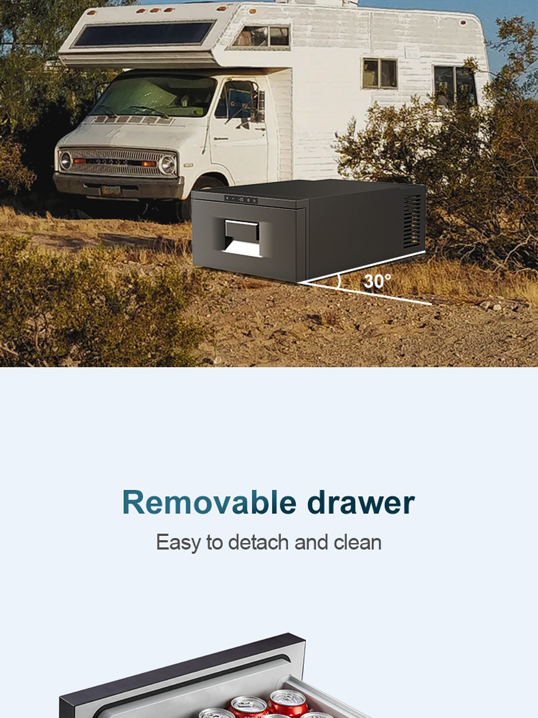 El refrigerador de cajón D30 está diseñado para caber en los espacios más reducidos, como la parte trasera de su 4x4, en un bote o en vehículos recreativos más pequeños. El frigorífico convierte cualquier rincón en desuso, como el espacio debajo de un asiento, en un útil congelador de 20 L. El frigorífico de cajón D30 proporciona una solución flexible y de gran eficiencia energética para mantener las bebidas frías o los alimentos congelados. Está construido resistente con un gabinete de acero y un cajón removible para facilitar la limpieza. D30 también tiene un panel de control digital fácil de usar, que le permite configurar la temperatura deseada. Los cajones deslizantes hacen que sea muy fácil abrir y cerrar el refrigerador.